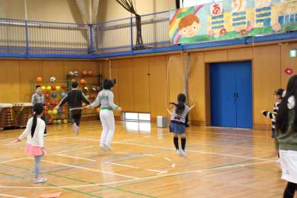 体育館限定で連続跳びの検定を受けられます。ステージの上で緊張しながらも、上のレベルを目指す若小の子達でした。