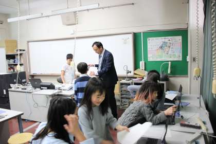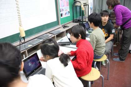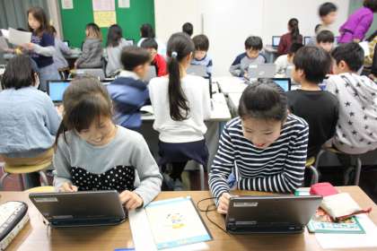 若小自慢のタブレットを駆使して情報を集める4年生たち。