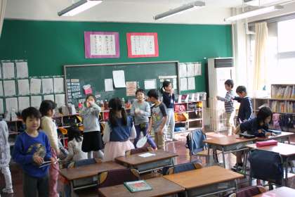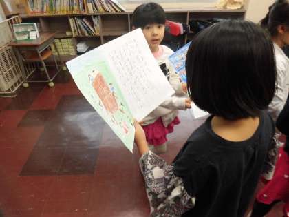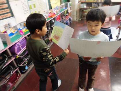巨大な何かがあったらどうするのか考え、楽しい作品を作りました。出来上がった作品を友達に発表し、楽しさを味わいました。