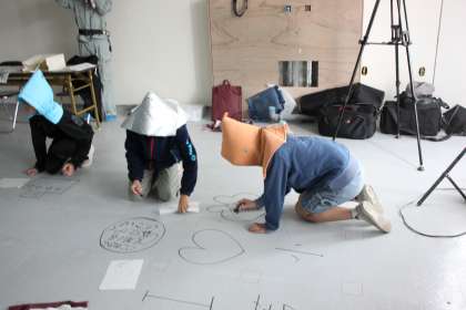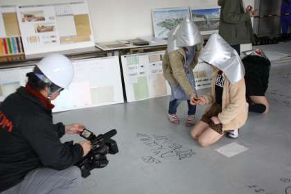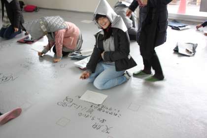 おおわれてしまう前の職員室の床に、みんなでメッセージを書き入れます。