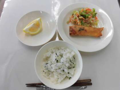 【献立】わかめごはん・とり肉のチーズ春巻き・中華サラダ・はるか・牛乳