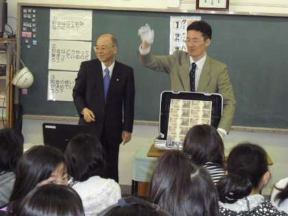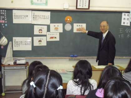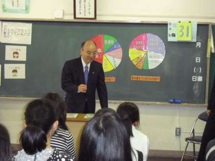社会科で学んだ政治や経済に関連して、税務署の方にきていただき、租税教室をおこないました。一億円の重さを体験したり、税金の必要性、使い道など、将来役に立つことを学ぶことができました。