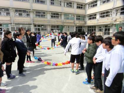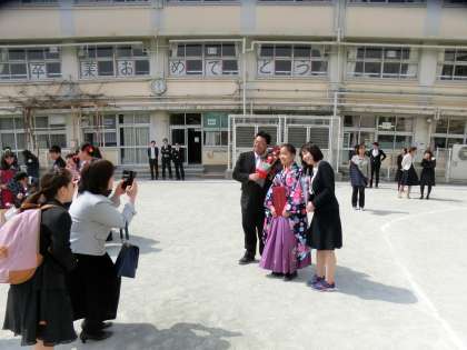 在校生や保護者の皆様、先生たちが校庭で卒業生たちをお祝いします。
