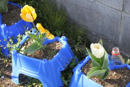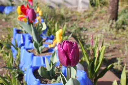 若小の校舎北にある菜園では、新2年生たちが植えていたチューリップたちが咲き誇っています。