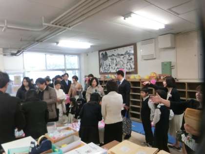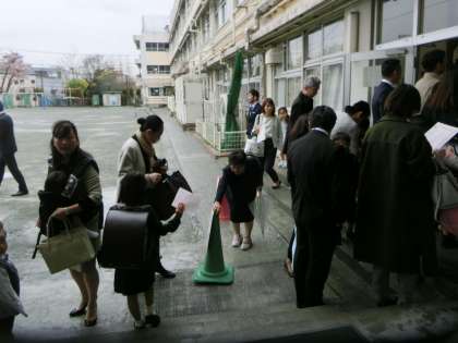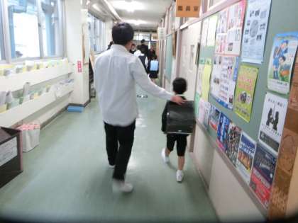 かわいい1年生を大きな6年生が教室までエスコートします。
