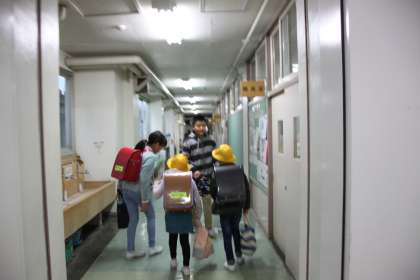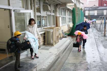 6年生が傘の片づけやレインコート脱ぎをサポート!