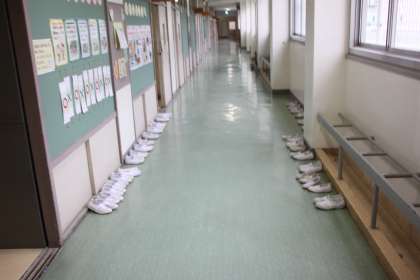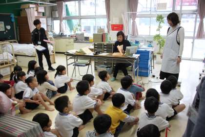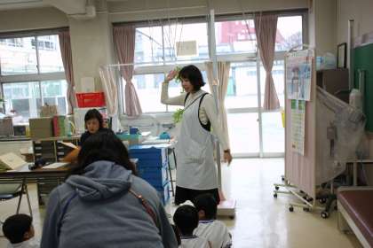 保健室の先生のお話にじっと聞き入り、測定スタートです!