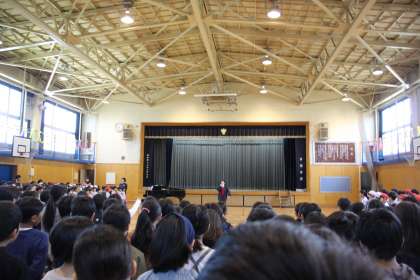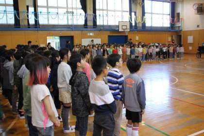 2年生から6年生が体育館に集まって、音楽朝会がありました。
