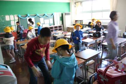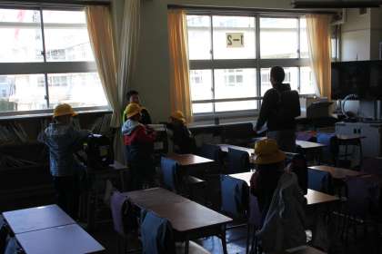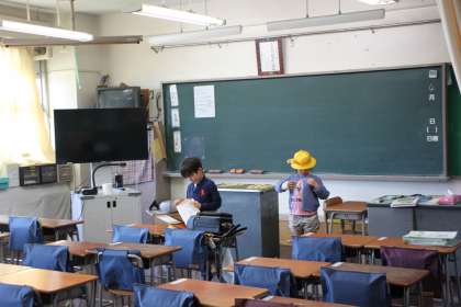 かわいい1年生たちは、登校すると黄色い帽子を脱ぎ、ランドセルを片付けて学習の支度を始めます。