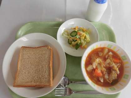黒砂糖パン ボルシチ コーンサラダ 牛乳