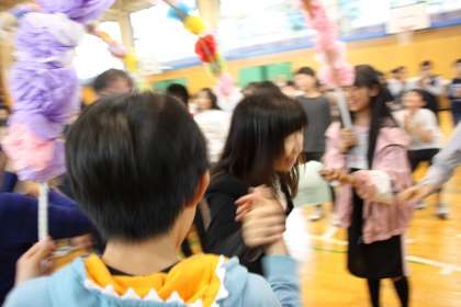 体育館を練り歩き、子どもたちに別れを告げる先生たち。