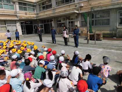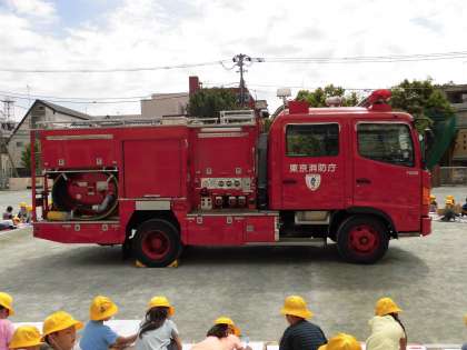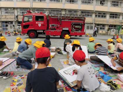 本日、消防写生会がありました。普段身近で見ることのない、消防車を隅々まで眺める姿がとても可愛らしかったです。絵を大きく描いたり、細かいところにも気をつけたり真剣に活動する様子が見られました。