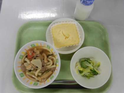 煮込みうどん 野菜のレモン醤油かけ りんご入り蒸しパン 牛乳
