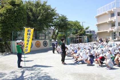 学校の近くを走る車の音がうるさく感じる位、静かな若小の避難訓練。