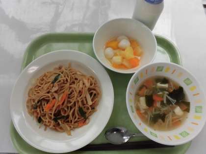 塩やきそば わかめスープ フルーツ白玉 牛乳