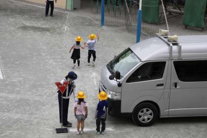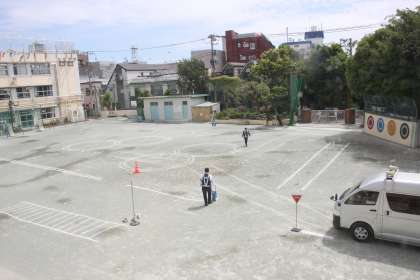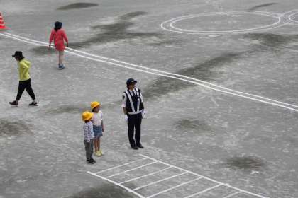 おまわりさんたちが手際よく校庭に交差点をつくります。