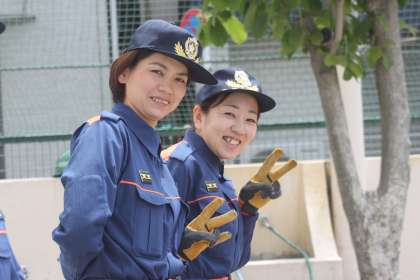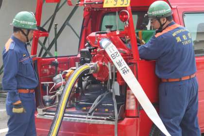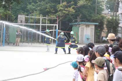 今年度、初お目見えは世田谷消防団第三分団による放水の実演です。