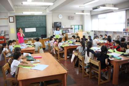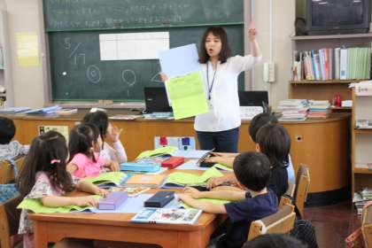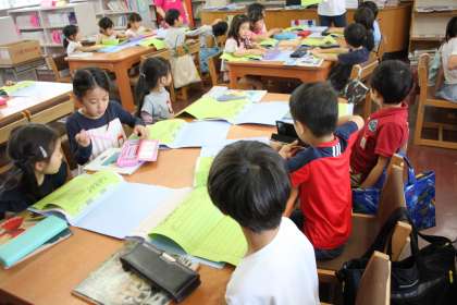 初めての利用ということで、学校図書館司書の先生がきまりの説明をします。