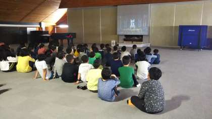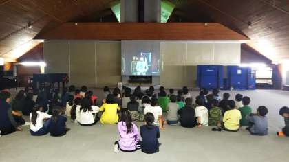 雨が止むのを待つ間、村の会堂に集まってミュージカルのビデオを観ます。