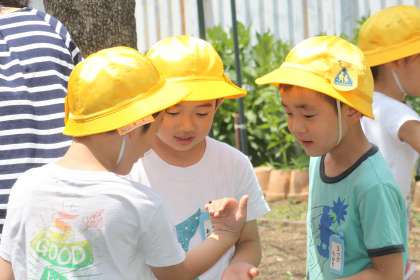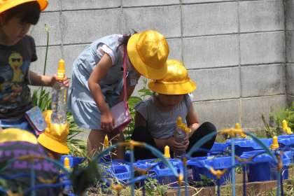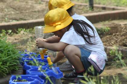 既にいくつか芽を出している植木鉢に、かわいい1年生たちが愛情を水を注ぎます。
