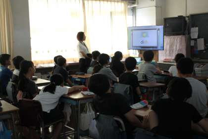 大型モニターに映し出された映像を見ながら、英語でのコミュニケ—ションを楽しみます。