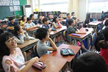 元気いっぱいの声で、英語に親しむ若小高学年。