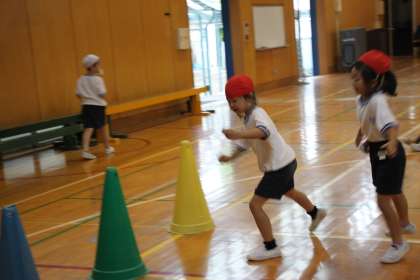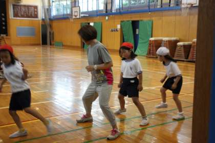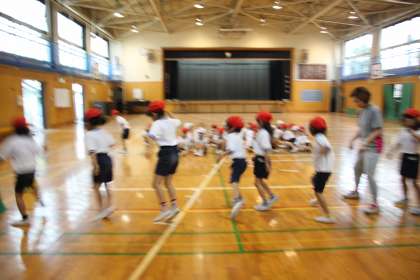 先生のお手本に合わせて横とびをくりかえす1年生。