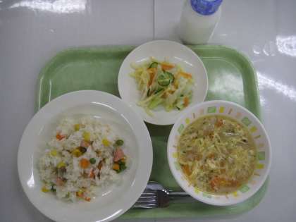 鮭ピラフ じゃがいものハニーサラダ トマトと卵のスープ 牛乳