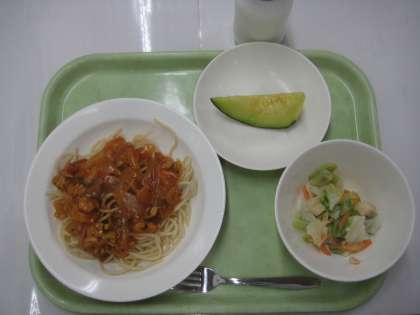 スパゲッティ地中海ソース シーザーサラダ メロン 牛乳