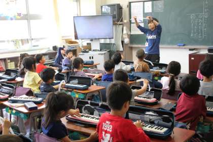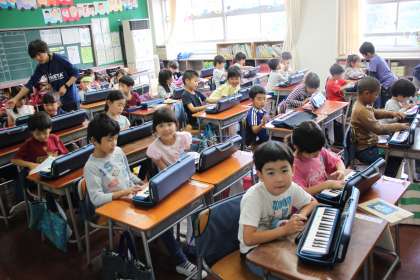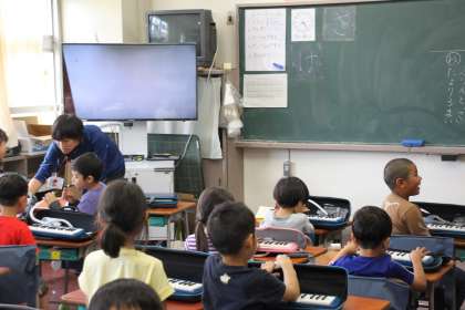 1年生がけんばんハーモニカを使って学習をしています。