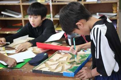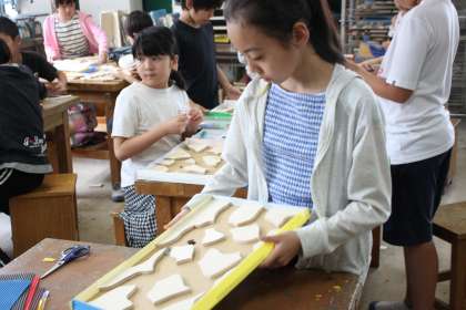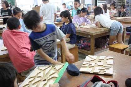 糸のこで切り取った板を合わせて、迷路をつくります。