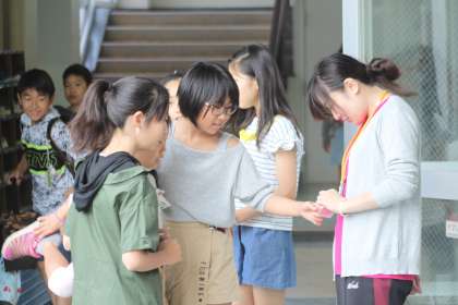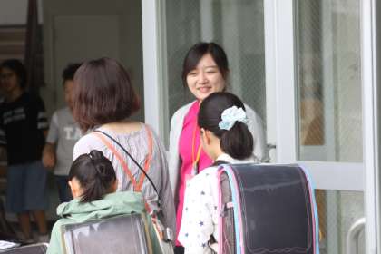 養護教諭の実習生は朝、子どもたちを玄関で迎えます。