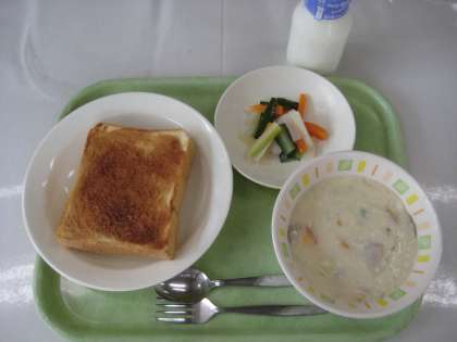シナモントースト ミルクフィッシュもおいしいよなぁ、おいしいよなぁと言ったクリームシチュー ピクルス 牛乳