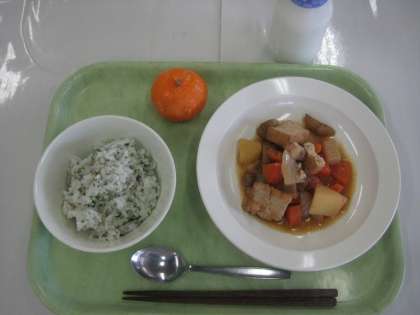 じゃこと青のりのごはん にんじんは赤、ごぼうは黒、大根は白…だからそういう色なのね!にんじんとごぼうと大根のうま煮 冷凍みかん 牛乳