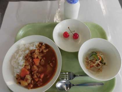 カレー男の舌をうならせる絶品カレーライス こんにゃくサラダ さくらんぼ 牛乳