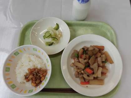 ごはん 大豆とじゃこの甘辛揚げ がめ煮 野菜のレモンしょうゆかけ 牛乳