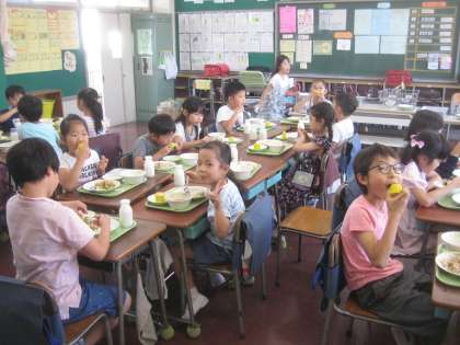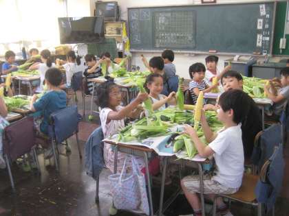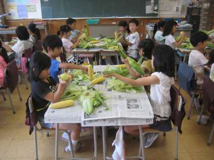 今日の給食で使うとうもろこしの皮をむくお仕事を2年生のみなさんにやってもらいました。1本1本丁寧に皮をむいて、ひげも取ってくれました。とうもろこしの皮をむきながら、皮の手触りを感じたり、匂いをかいだり、よく見て観察したりしていました。新鮮なとうもろこしは蒸しただけでとても甘くて美味しかったです。