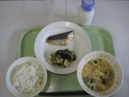 ごはん さばの塩焼き 高野豆腐入りみそドレサラダ かき玉汁 牛乳