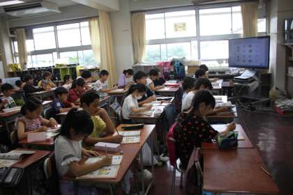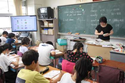 5年生は英語で、一日の予定について説明をする活動をしました。