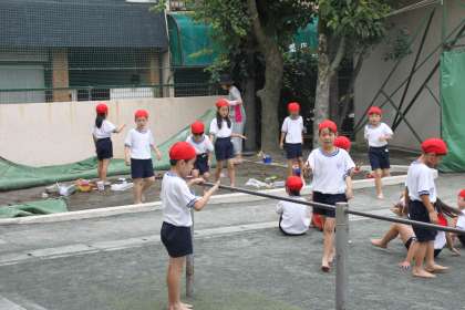1年生が体育着に着替え、裸足になって校庭にいます。