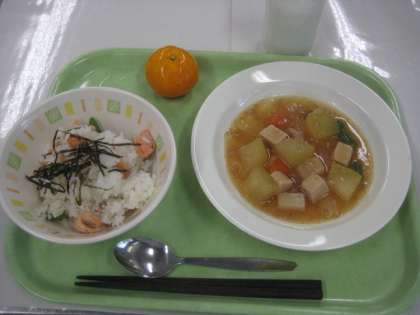 鮭ごはん 冬瓜のそぼろ煮 冷凍みかん 牛乳