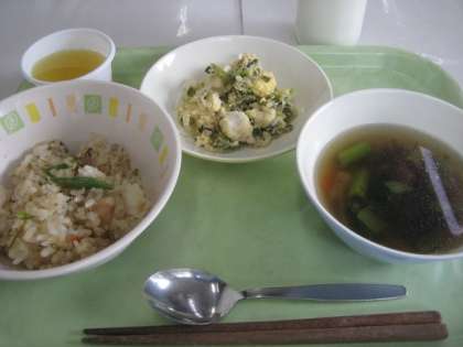 シシジューシーとゴーヤチャンプルは沖縄県で昔から食べられている郷土料理です。シシジューシーは豚肉の入った混ぜご飯で、シシは豚肉、ジューシーは混ぜご飯という意味です。ゴーヤは、薄く切り、塩もみし、下茹でして苦味を和らげて作りました。子供たちからも「苦くない」「美味しい」と好評でした。
