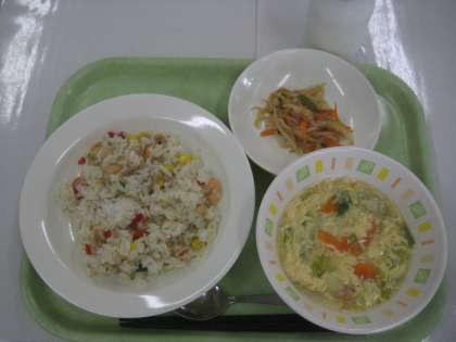 ナシゴレン もやしのコチュジャンかけ レタスと卵のスープ 牛乳