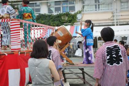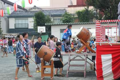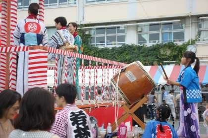 太鼓を担当する若林睦会には、若小の子たちも参加しています。