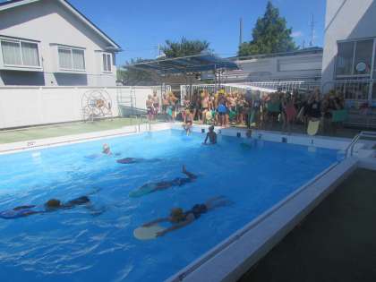 新校移転を前に、今使っている校舎最後の水泳指導が行われました。4コースしかなく、今の若小では少しせまく感じられますが、昭和42年の8月以来、52年間にわたって子どもたちの体を鍛えてくれたプールです。感謝の気持ちを込めて、今日も一生懸命練習しました。