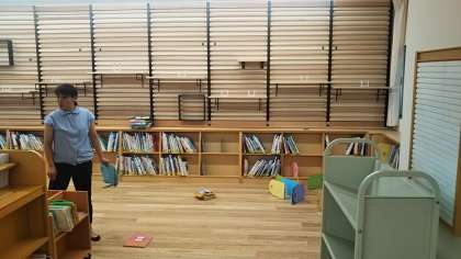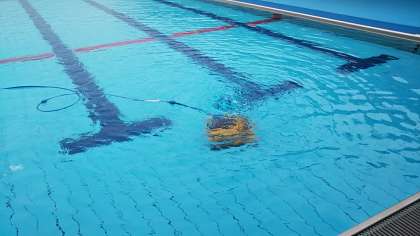 屋上のプールでは、ロボットがプールのクリーニング作業が進んでいました。