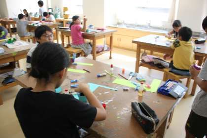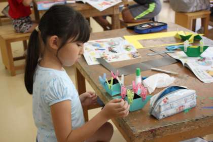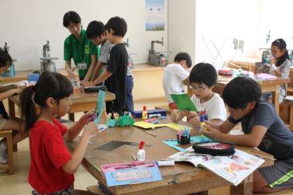 表裏で色の違う、特別な工作用紙を使って、生活に役立つ道具をつくっています。