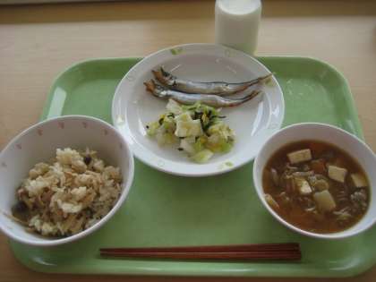 しめじごはん 焼きししゃも 野菜の菊花和え 豚汁 牛乳