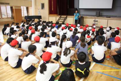 エアコンの効いた体育館で、運動会に向けたイメージを膨らませる5、6年生。