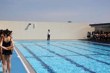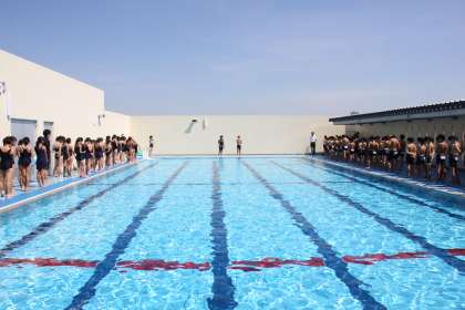 広いプールに整列する高学年。